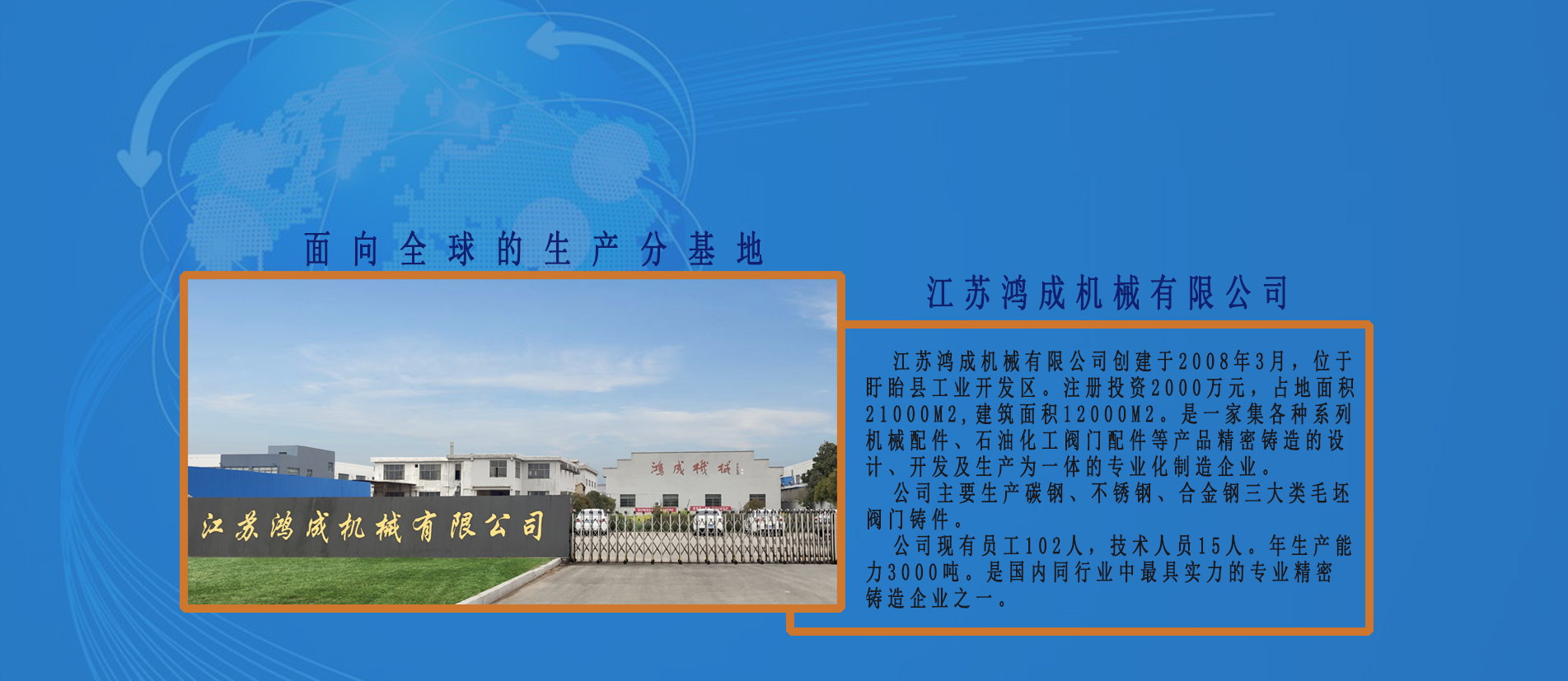 成立于江蘇程投資2008,占地面積25000 m2專業生產超過DN200口徑,體重超過150公斤。